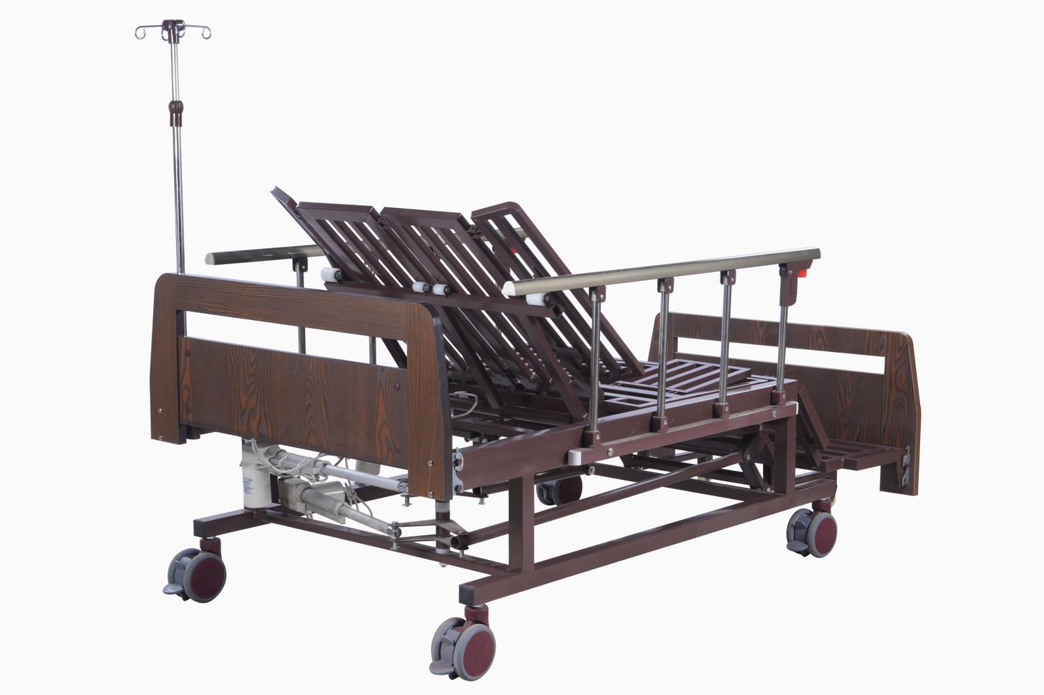Медицинская электроприводная кровать-кресло с электрическим туалетным устройством и электрифицированной функцией переворачивания с таймером для автоматической смены положения. Дополнительные функции: регулируемый таймер для автоматического переворачивания в ночное время, тормозная система с индивидуальными тормозами.