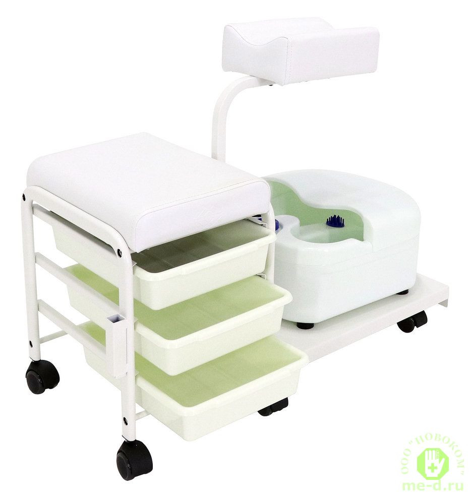 Конструкция имеет встроенный лоток для хранения всех необходимых инструментов и расходных материалов. Это позволит всегда держать рабочее место в порядке, обеспечит быстрый доступ до нужных в процессе процедуры вещей. Также тумба оборудована ванночкой для ног, которая позволит проводить сразу весь комплекс процедур.